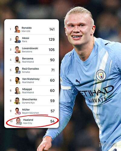 25岁哈兰德52场欧冠轰入54球,目前排在欧冠历史射手榜第10。距离第9的穆勒差3球。