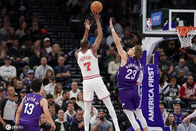 中场休息过后,火箭队也没有好起来。尽管,杜兰特一上来就命中了两记招牌跳投,让分差稍有缩近。但之后,KD却没有展现战术吸引力,没能由他的得分,以点带面去助推身边队友的发挥。