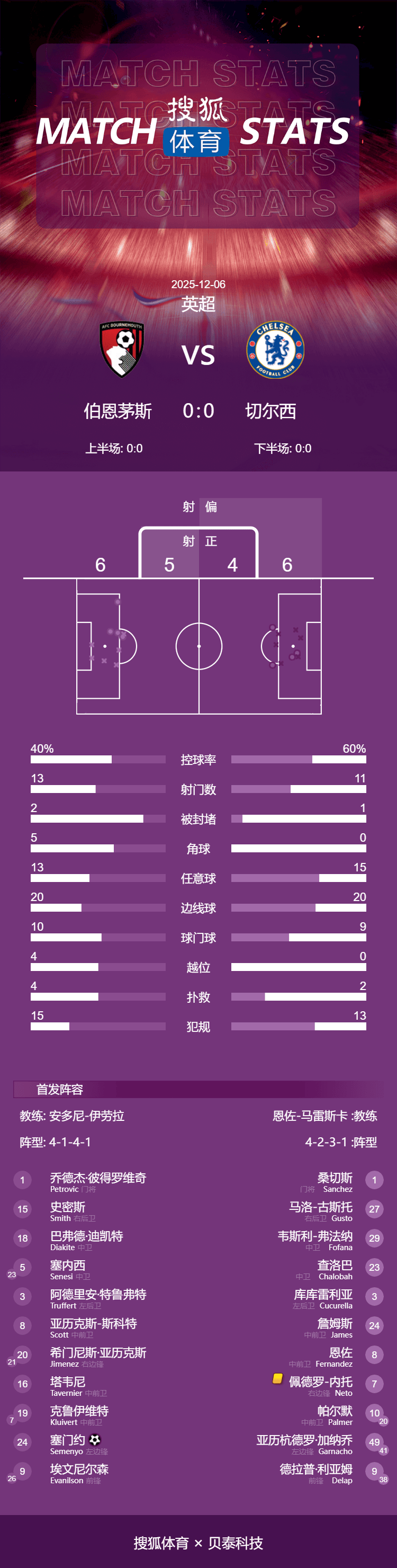 北京时间12月6日23点,2025/26赛季英超联赛第15轮继续进行,切尔西奔赴活力球场挑战伯恩茅斯。经过90分钟激战,双方均未能攻破对手球门。上半场,塞梅尼奥进球因越位被吹,德拉普伤退,桑切斯多次神扑;下半场,加纳乔头球中柱,两队仍无法改写比分。最终,切尔西客场0-0战平伯恩茅斯,遭遇联赛三轮不胜。