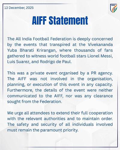 印度足协发布声明表示,梅西的“印度行”为某公关公司策划的私人活动,足协并未以任何形式参与该活动的组织、筹备和执行工作。此外,该活动的相关细节也并未向印度足协申请和报备。