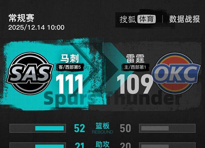 北京时间12月14日,2025-26赛季NBA杯半决赛,圣安东尼奥马刺和俄克拉荷马雷霆狭路相逢。全场打完,雷霆109-111不敌马刺,无缘NBA杯决赛,而他们此前的16连胜纪录也宣告终结了。