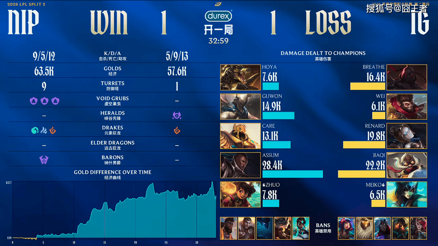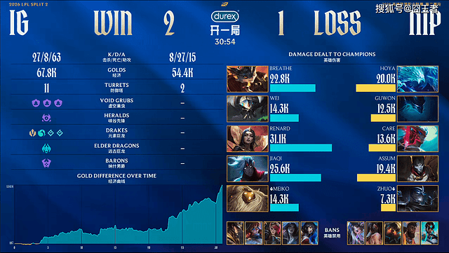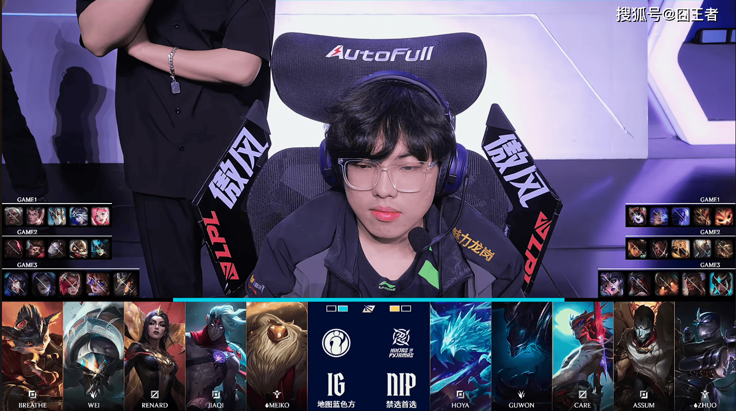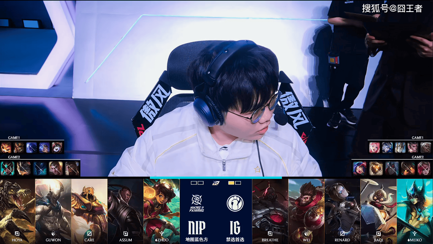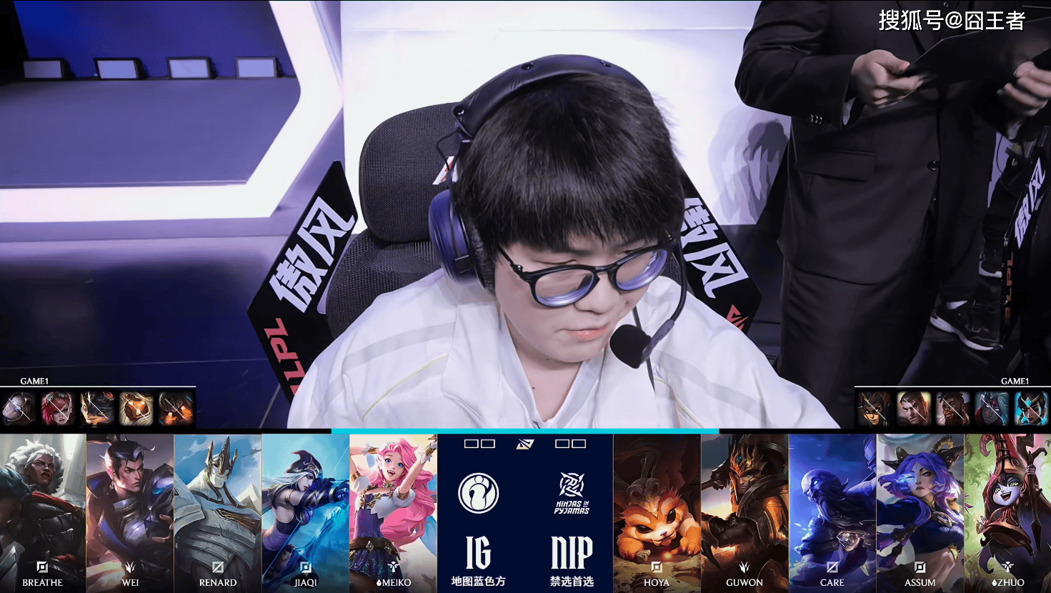 第一局比是,IG蓝色方,禁用:发条、蔚、兰博、巴德、泰坦,选用:Breathe狼母、Wei赵信、Renard加里奥、Jiaqi寒冰、Meiko歌姬;NIP红色方,禁用:扇子妈、韦鲁斯、奎桑提、杰斯、蛇女,选用:Hoya纳尔、Guwon皇子、Care瑞兹、Assum芸阿娜、Zhuo露露