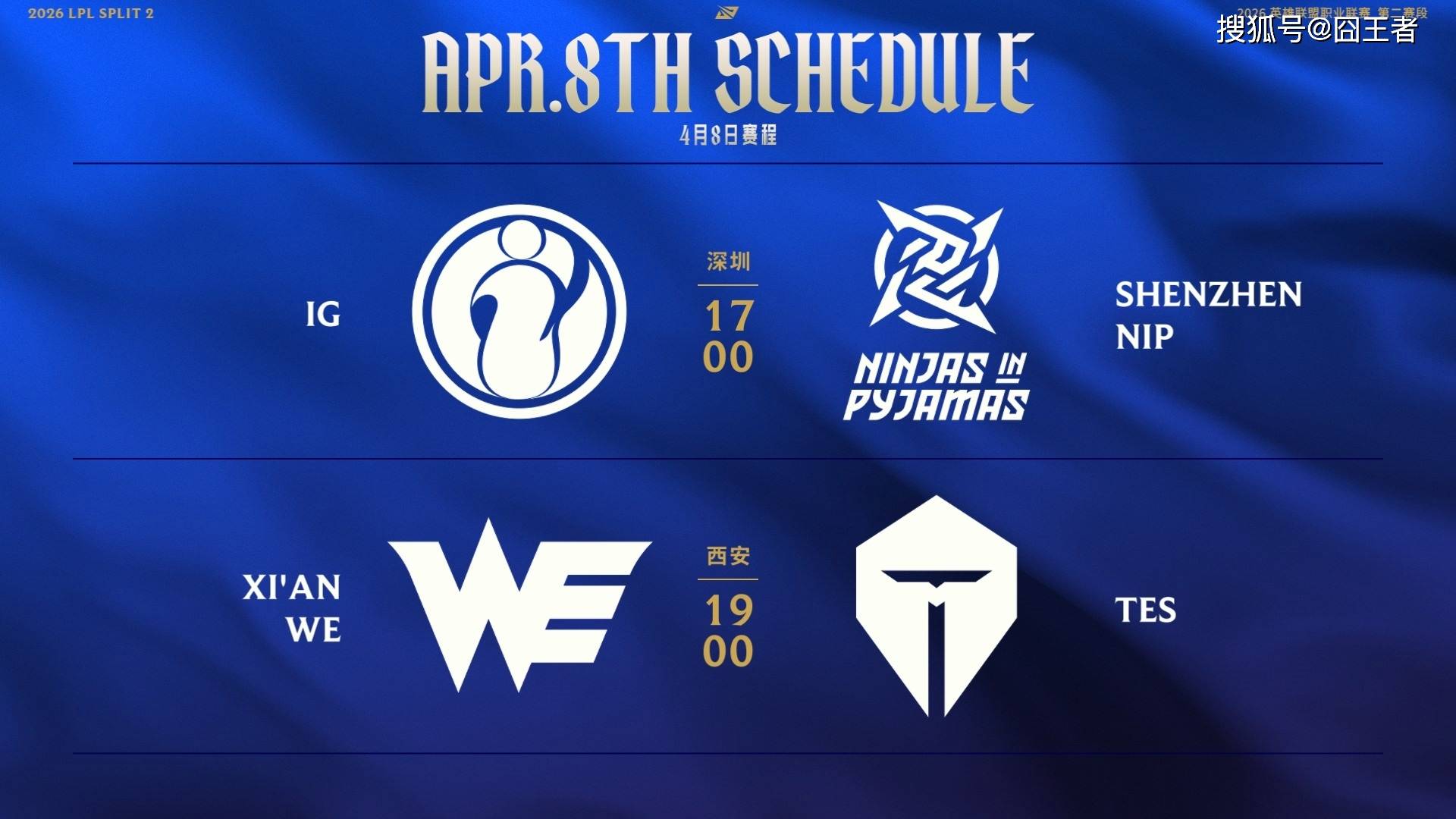 按照赛程,4月8日的比赛,将由IG对阵NIP,WE对阵TES。他们谁能获胜,就让赛场来告诉我们吧。